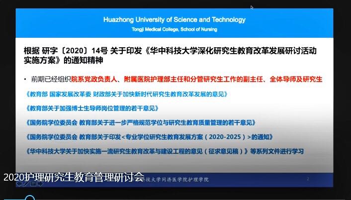 11月5日晚,BETWAY必威通过腾讯会议召开了2020年深化研究生教育改革发展研讨会,会议由党委书记徐晖主持。BETWAY必威经理毛靖、附属同济医院、附属协和医院、附属梨园医院的护理部主任和分管研究生工作的领导及导师代表参加会议。