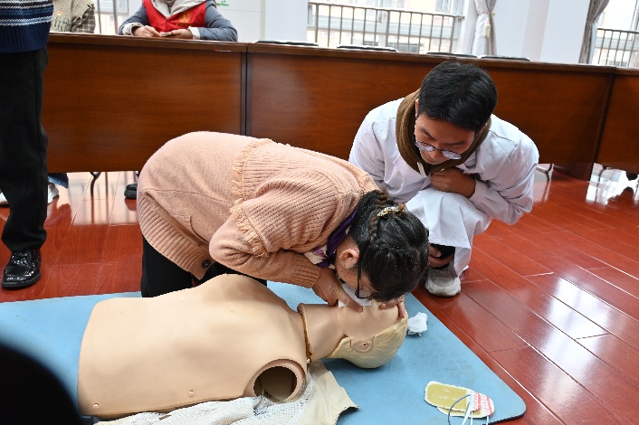 首先,在常用急救知识情景演示环节,团队成员朱荆琳、王俊鹏及班凤晓通过课程讲解及实景演示结合的形式,为在场老人开展心肺复苏及海姆立克法两种急救技能的科普分享。生动形象的科普让许多老年人从“围观凑热闹”到“主动积极参与”,他们眼中满含求知欲,并在培训后主动提问、举手参与模拟急救演练。