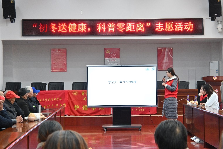 义诊结束后,进入健康知识宣讲环节,医博团成员围绕“守护生命,救在身边”、“老年心理健康”、“常见慢病自我管理”、“日常膳食营养指南”四大主题开展科普讲座。本次科普讲座包括常用急救知识情景演示、身心健康知识宣讲以及健康知识科普竞答三个环节。吸引了50余位社区老年居民和社区工作人员前来参与学习。