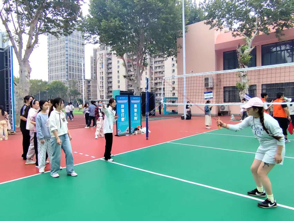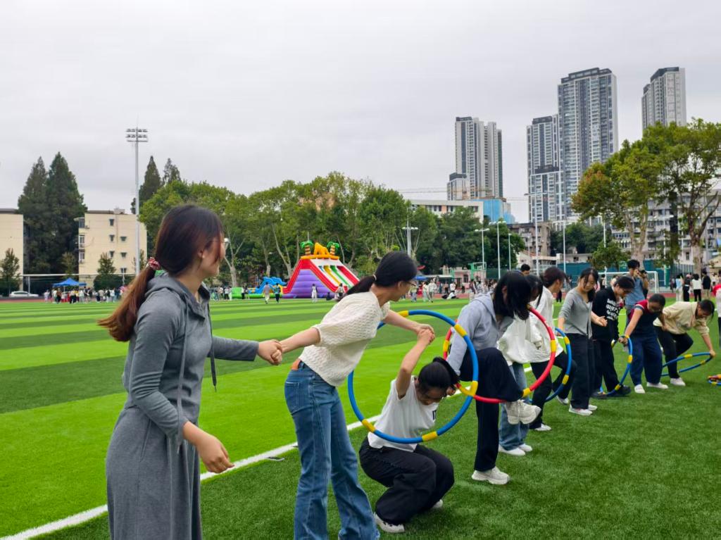 “一圈到底”项目的赛场,气氛格外热烈。同学们手拉手站成一排,眼神里满是期待与专注。当呼啦圈从队伍一端开始传递,大家迅速调整姿势,或抬高胳膊、或弯腰下蹲,在不松手的前提下,巧妙地让呼啦圈穿过身体,传递给下一位伙伴。十个彩色的呼啦圈在大家手中快速而有序地传递着,像一条灵动的彩带,穿梭在人群之间,每一次成功传递,都伴随着欢快的笑声与喝彩,我们团队以1分钟出头的成绩获得了该项目的第二名,单项成绩取得10分!这个项目,不仅考验着大家的身体协调性,更让同学们深刻体会到团队默契配合的力量,为趣味运动会增添了别样的精彩。
