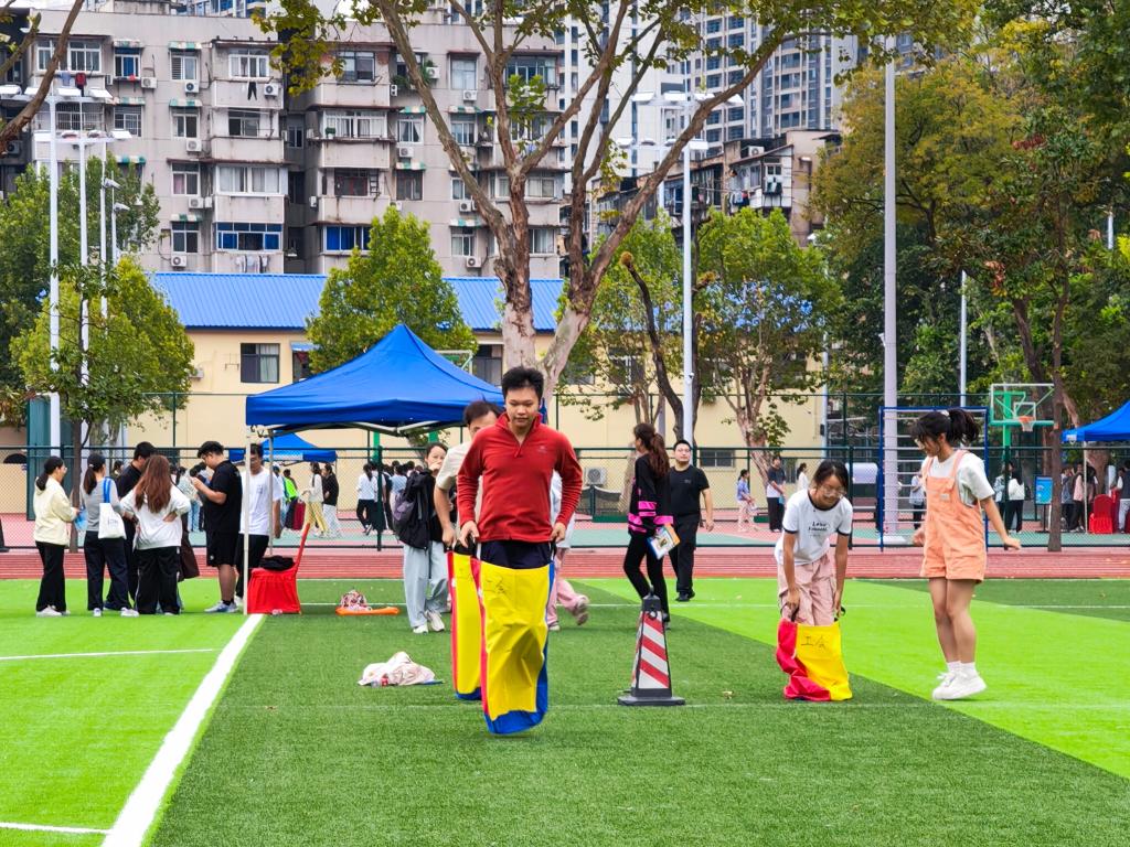 首先登场的是女生,第一位女生麻利地套上布袋,如同灵动的袋鼠。随着裁判哨声响起,她双腿并拢,用力一蹦,布袋随着跳跃的节奏上下晃动,她眼睛紧紧盯着对面的男生区域,每一次落地都扎实有力,朝着目标奋力前进。当女生抵达对面后,男生立刻接上,在这场袋鼠接力赛里,三男三女的接力配合,不仅展现了同学们的蓬勃活力,更传递出团结协作、奋勇争先的精神,为趣味运动会留下了一抹亮丽的色彩。