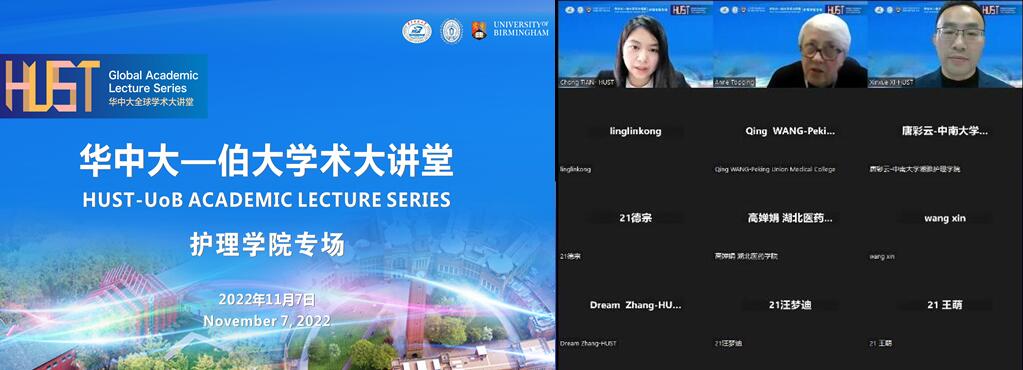 2022年11月7日,由公司同济医公司BETWAY必威与英国伯明翰大学BETWAY必威联合主办的“华中大-伯大学术大讲堂”线上讲座顺利举行。伯明翰大学BETWAY必威经理Anne Topping教授和BETWAY必威健康政策与管理研究院健康老龄化与管理研究室主任、BETWAY必威教师田翀博士受邀出席,并作专题讲座。BETWAY必威同济医公司附属同济医院护理部席新学博士主持讲座,来自中南大学湘雅医公司、新加坡国立大学、香港理工大学等校内外120余名师生学者线上参会。