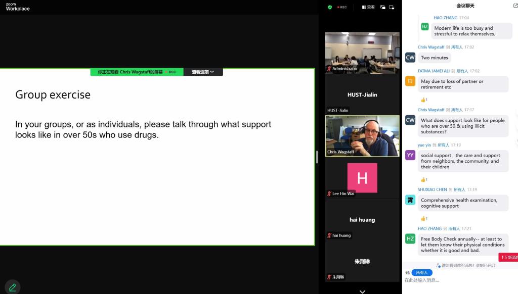 课程围绕物质使用、精神疾病和风险评估展开,涵盖物质依赖与耐药的概念、50岁以上人群物质使用情况、精神疾病风险评估方法以及激励性访谈等干预手段的开展方法。此外,课程还详细介绍了双相情感障碍(包括特征、影响、治疗等)、精神分裂症(涉及病因、症状、治疗等)以及强迫症(症状、影响、干预手段等)等常见精神疾病。Christopher Wagstaff教授通过专题授课,结合案例分析、小组讨论等形式引导员工对精神疾病的相关问题进行批判性分析。