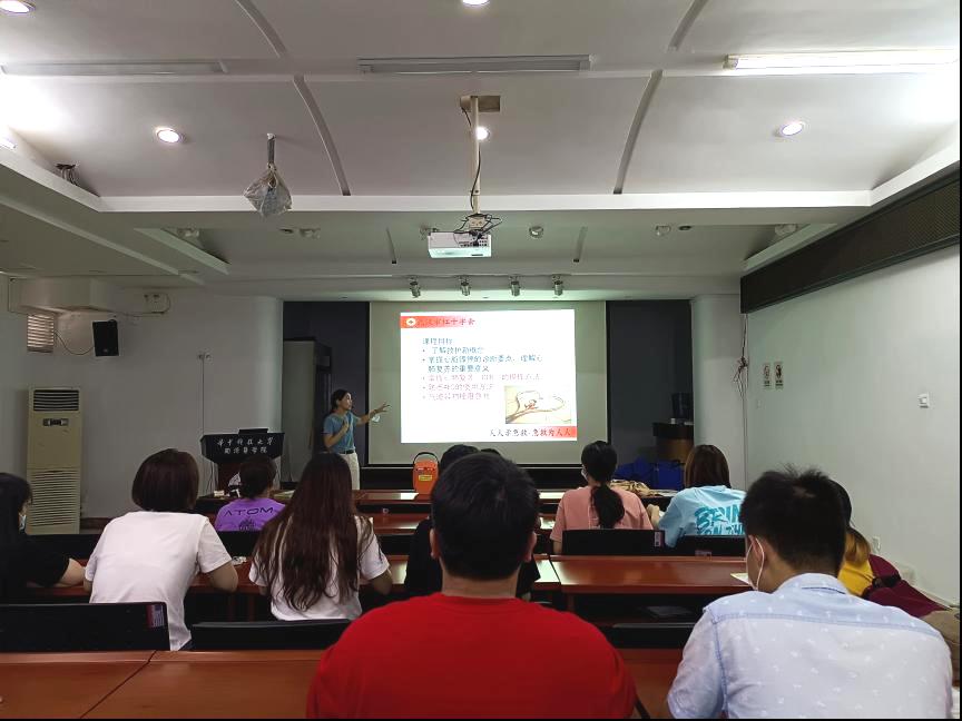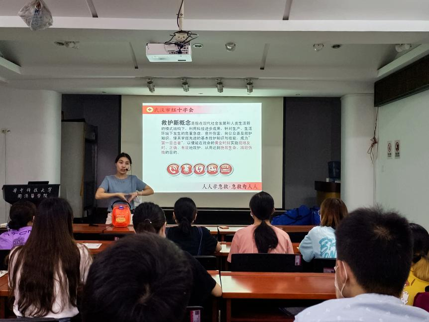 首先是何妮老师为同学们讲解理论知识。何妮老师语言幽默风趣,结合自己身边的故事和具体案例使同学们对应急救护的必要性有了更深刻的认识。同时,何妮老师也用深入浅出的语言给同学们讲解了心肺复苏的完整步骤和注意事项、AED的使用方法、创伤救护的四项基本技能(止血、包扎、固定、搬运)等内容。