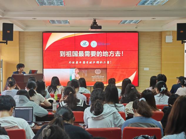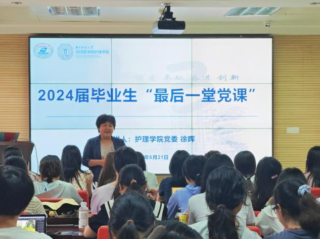 徐晖以“护理担使命,青春献未来”为题,分别从“我们身处的时代”、“我们所受的教育”、“我们面向的未来”三个方面为大家讲授。她深入解读了新时代健康工作者的使命与内涵,强调护理专业员工使命荣光,责任重大,号召全体毕业生党员要感受思想伟力,坚持不懈地用习近平总书记关于人民健康系列重要论述领航定向。