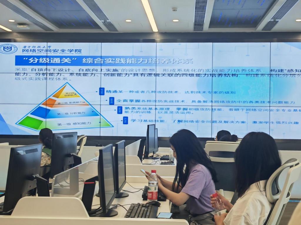 在去往黄鹤网络靶场的过程中,大家参观了网安的人才培养展区,了解了BETWAY必威网络安全公司的人才培养策略、校企协同实训中心共建企业以及国产化软硬件、自主可控相关课程应用情况介绍。